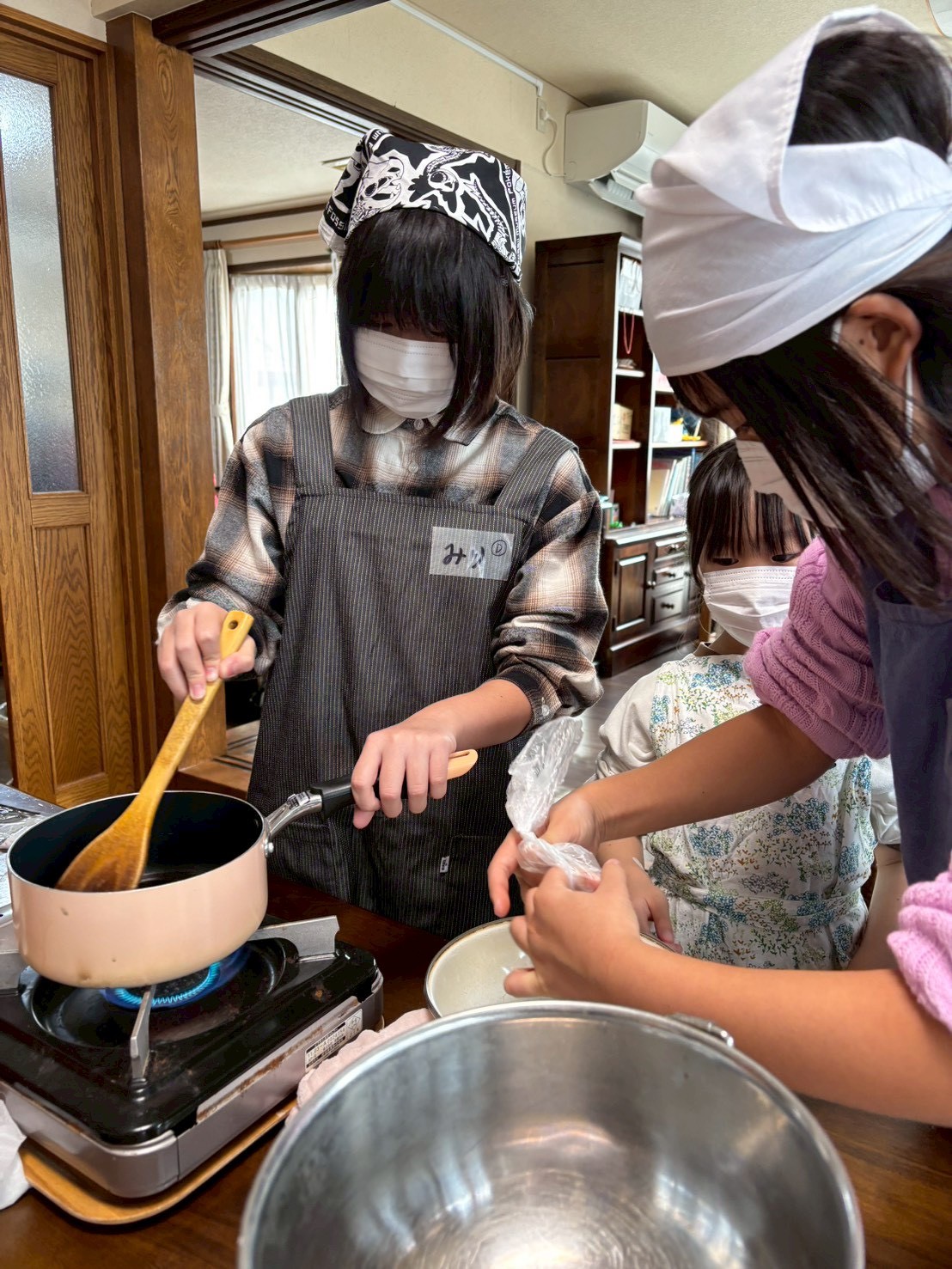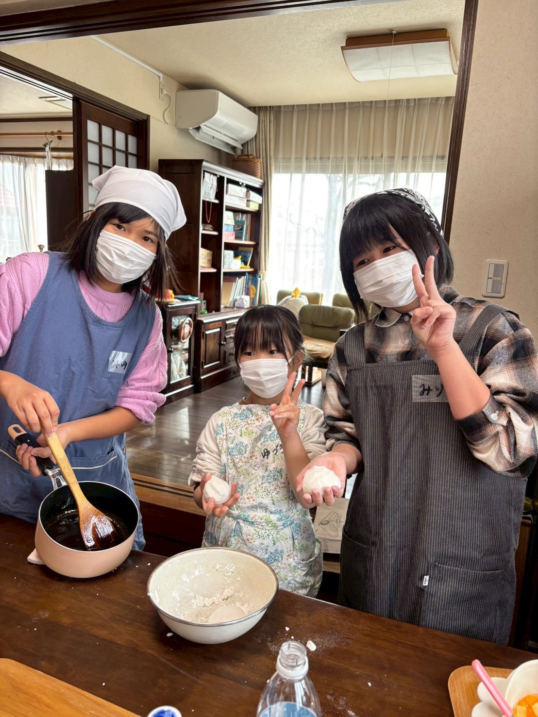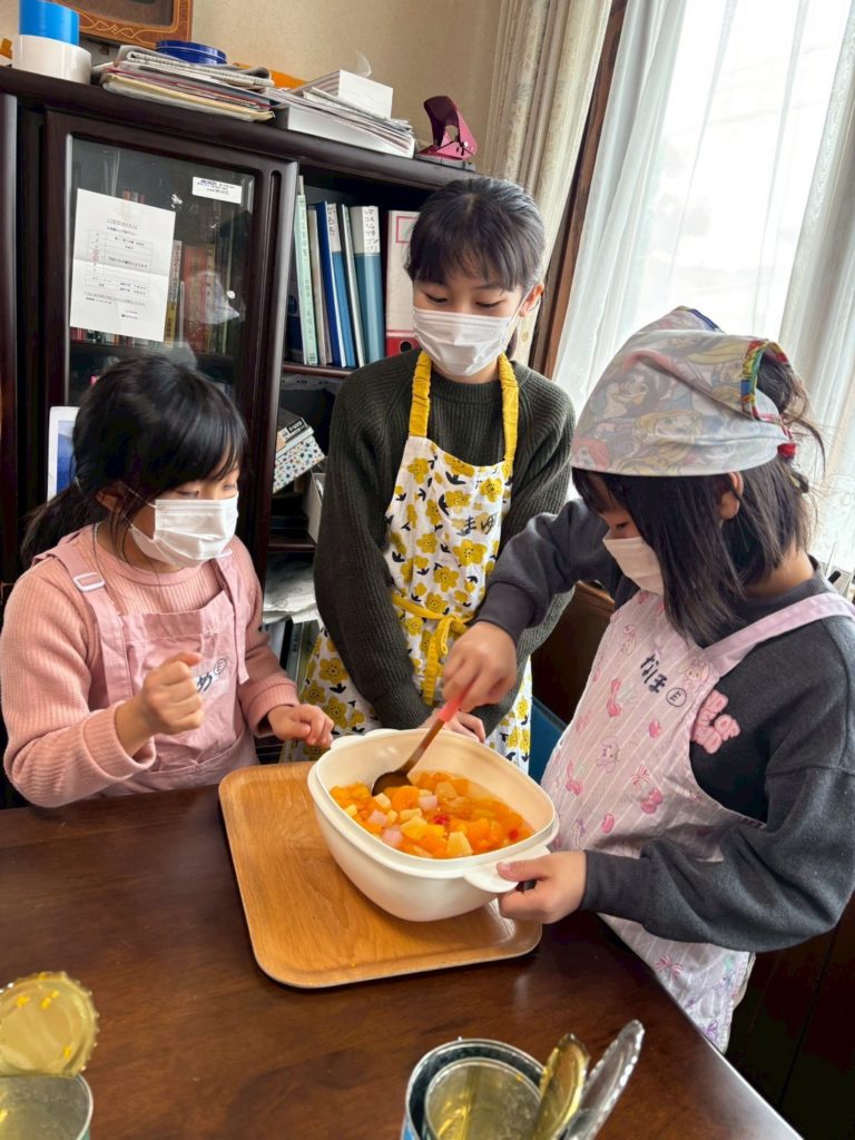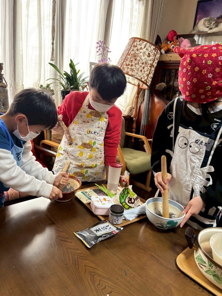 新春おだんごづくり🍡を楽しみました。20名 5グループに分かれ、あんこ・みたらし・ごま・フルーツ・黒蜜きな粉❢❢みんな力を合わせて制作に取り組みました。カセットコンロであんこや黒蜜を練り上げたり、胡麻すりにチャレンジしたり、フルーツ組は缶切りに挑戦❢❢ みたらしあんの絶妙な火加減もクリア❢❢最後には、みんなの作ったいろいろな味を少しずつ、たーっぷり味わいました。前回のクリスマスケーキ作りの時は、「自分の分だけ洗えばいいでしょ」なんて言っていた子も、最後の洗い物までしっかりやっている姿がとても微笑ましかったです。子どもは、いろいろな経験で大きくなっていくんだなって、実感のクッキングでした🍡🍡🍡